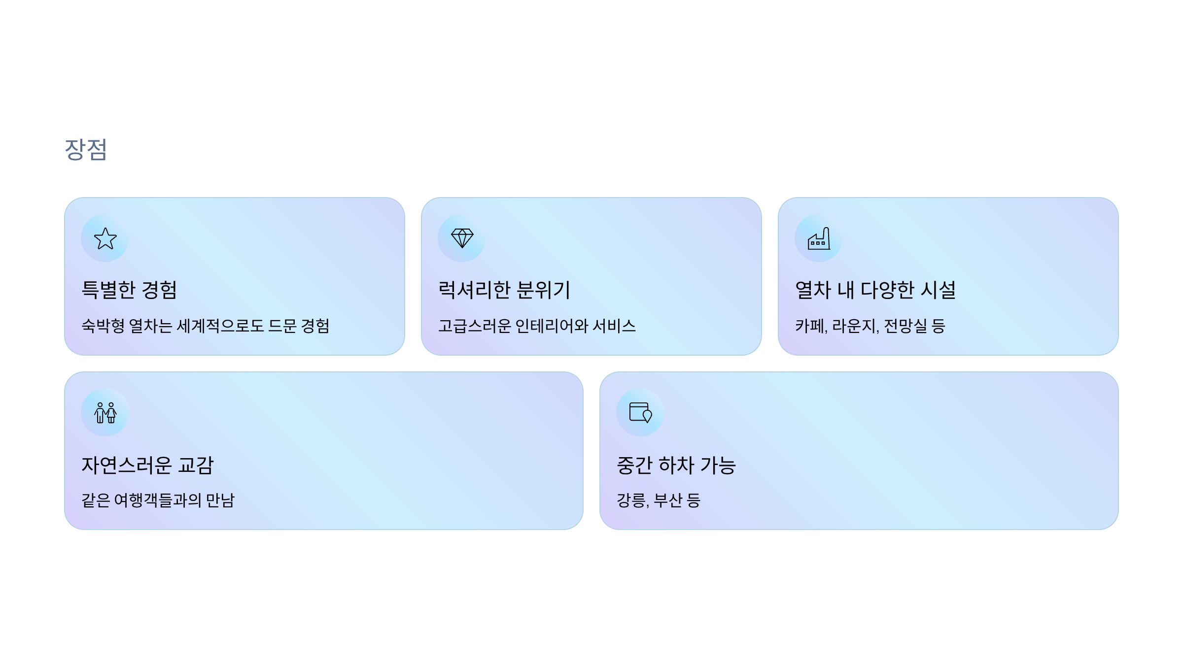 | 해랑 (1박2일) | 약 35만원 | 숙박형 열차, 럭셔리 | 특별한 경험 원하는 분 |