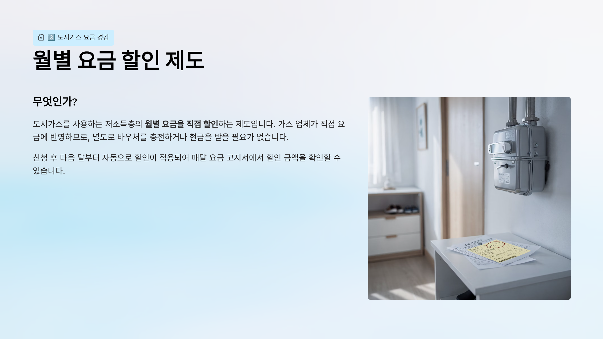- 도시가스를 사용하는 저소득층의 월별 요금을 직접 할인