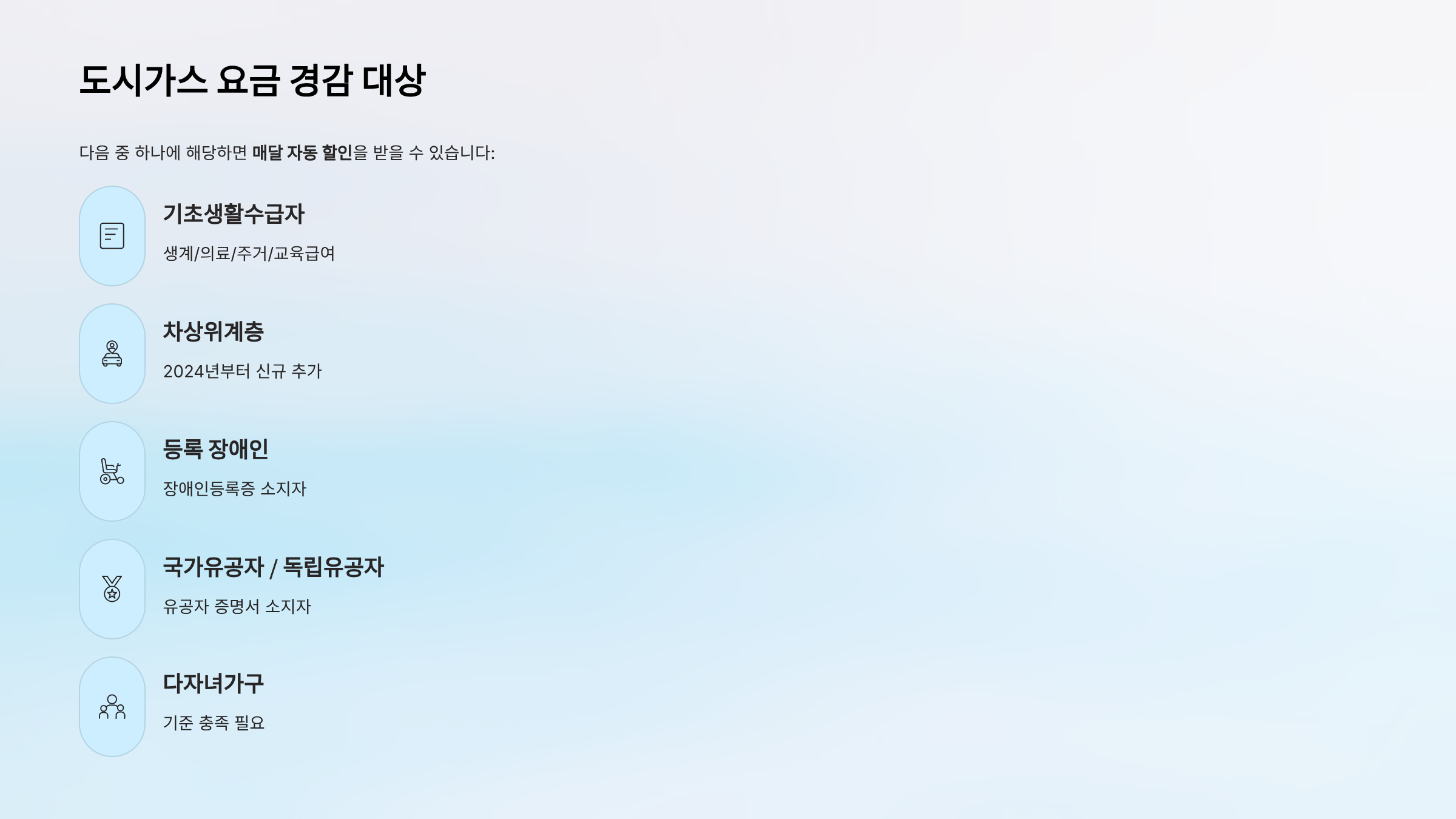 - ✅ 도시가스 요금 경감: 상시 신청 (기초/차상위/장애인/다자녀)