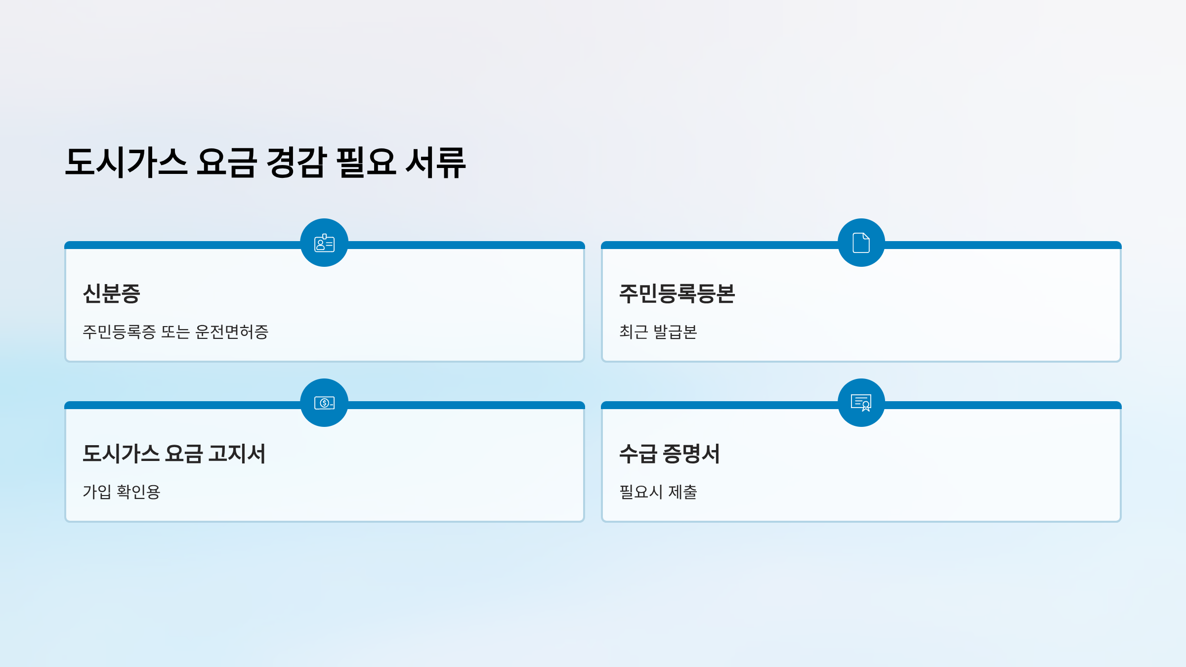 | 필요 서류 | 신분증, 등본, 통장사본 | 신분증, 등본, 수급증명서 | 신분증, 등본, 고지서 |
