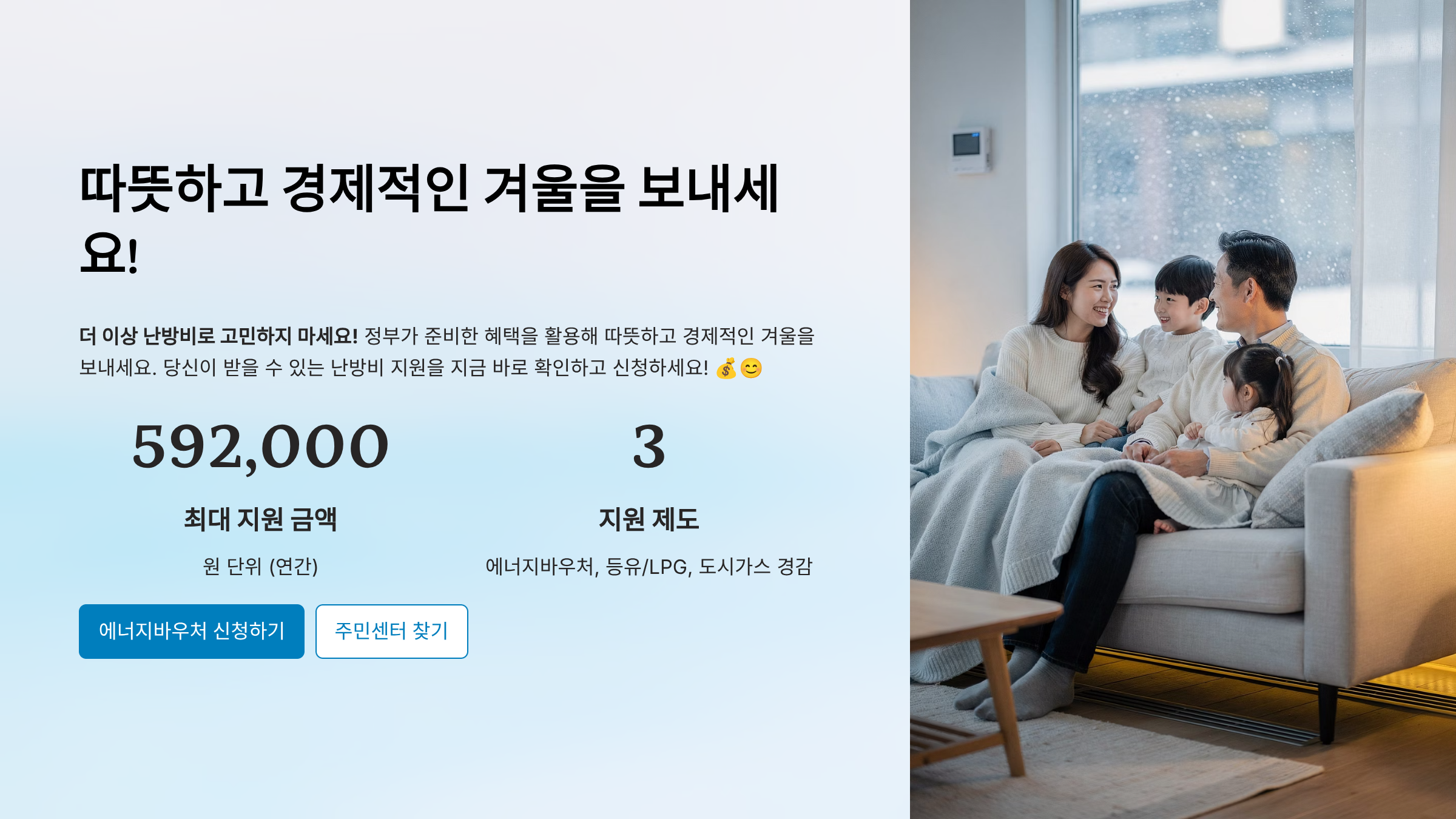 더 이상 난방비로 고민하지 마세요! 정부가 준비한 혜택을 활용해 따뜻하고 경제적인 겨울을 보내세요. 당신이 받을 수 있는 난방비 지원을 지금 바로 확인하고 신청하세요! 💰😊